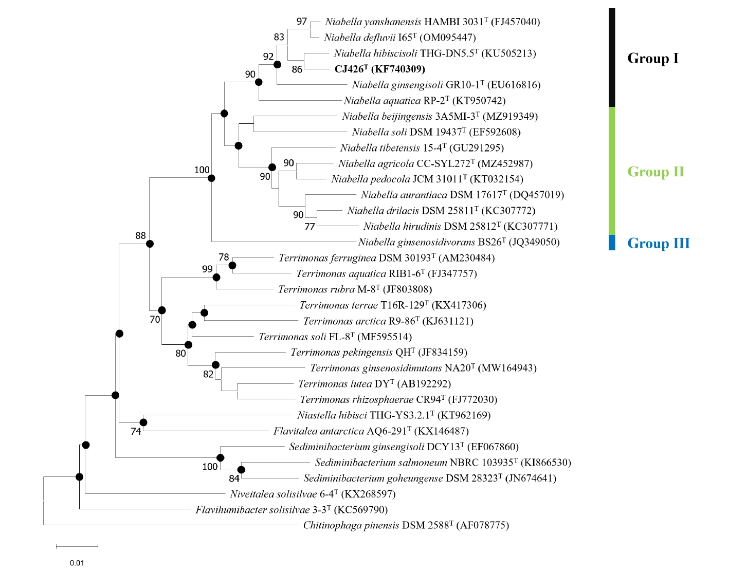 The 16S rRNA gene sequence of strain CJ426T showed the highest similarity (98.7%) to N. hibiscisoli THG-DN5.5T, followed by N. yanshanensis KACC 14980T (98.1%), and N. defluvii I65T (97.8%). In contrast, strain CJ426T showed the lowest similarity (92.3%) to N. tibetensis 15-4T, followed by N. beijingensis 3A5MI-3T (93.2%), and N. agricola CC-SYL272T (93.2%). The pairwise 16S rRNA gene sequence identities, which are below the established thresholds for species (≤ 98.7%) (Kim et al., 2014) and genus delineation (≤ 94.5%; 95% confidence interval [CI]: 94.55–95.05%) (Yarza et al., 2014), suggest that strain CJ426T can be proposed as a novel species and genus within the family Chitinophagaceae (Tables S1 and S2). Furthermore, based on the 16S rRNA gene similarity and the phylogenetic trees, the genus Niabella was divided into three preliminary groups (Fig. 1). According to the phylogenetic trees (Figs. 1, S1, and S2), strain CJ426T formed a robust cluster with N. hibiscisoli THG-DN5.5T and constructed a large clade with N. aquatica RP-2T, N. ginsengisoli GR10-1T, N. defluvii I65T, and N. yanshanensis HAMBI 3031T (named Group Ⅰ). The remaining Niabella species formed another distinct clade (named Group Ⅱ) separated from the above species (Group Ⅰ), while N. ginsenosidivorans BS26T formed a single distinct lineage (named Group Ⅲ). To elucidate more accurate taxonomic relationships among these groups, comprehensive analyses were performed using whole genome sequence data.