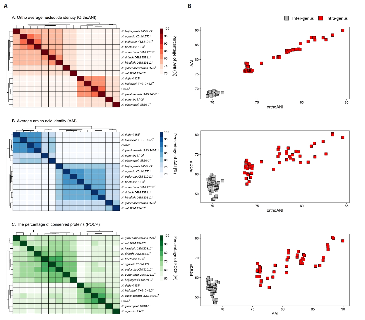 Pairwise correlations of OrthoANI, AAI, and POCP calculated from the genomes of Niabella and Paraniabella type strains. The pairwise correlation calculated using Spearman’s Rank Correlation Coefficient. ***p < 0.001.