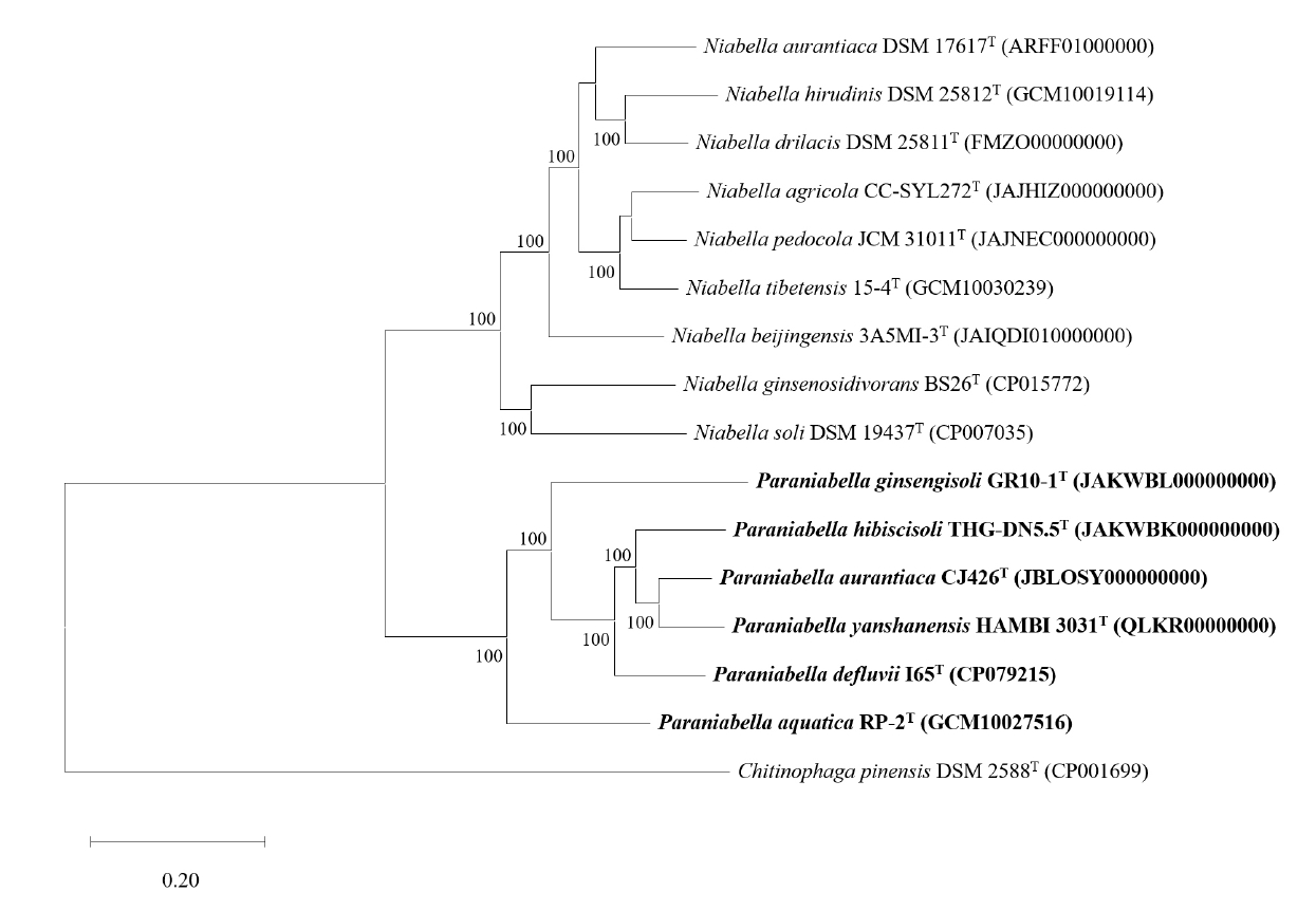 In this study, a novel bacterium, designated strain CJ426T, was isolated from ginseng soil and characterized using a polyphasic taxonomic approach in comparison with related type strains. Based on polyphasic taxonomic analyses, strain CJ426T is proposed as a novel species and genus, for which the name Paraniabella aurantiaca gen. nov., sp. nov. is proposed. Furthermore, genome-based phylogenetic analyses suggest that the closely related phylogenetic neighbours N. aquatica, N. defluvii, N. ginsengisoli, N. hibiscisoli, and N. yanshanensis be reclassified into this novel genus.