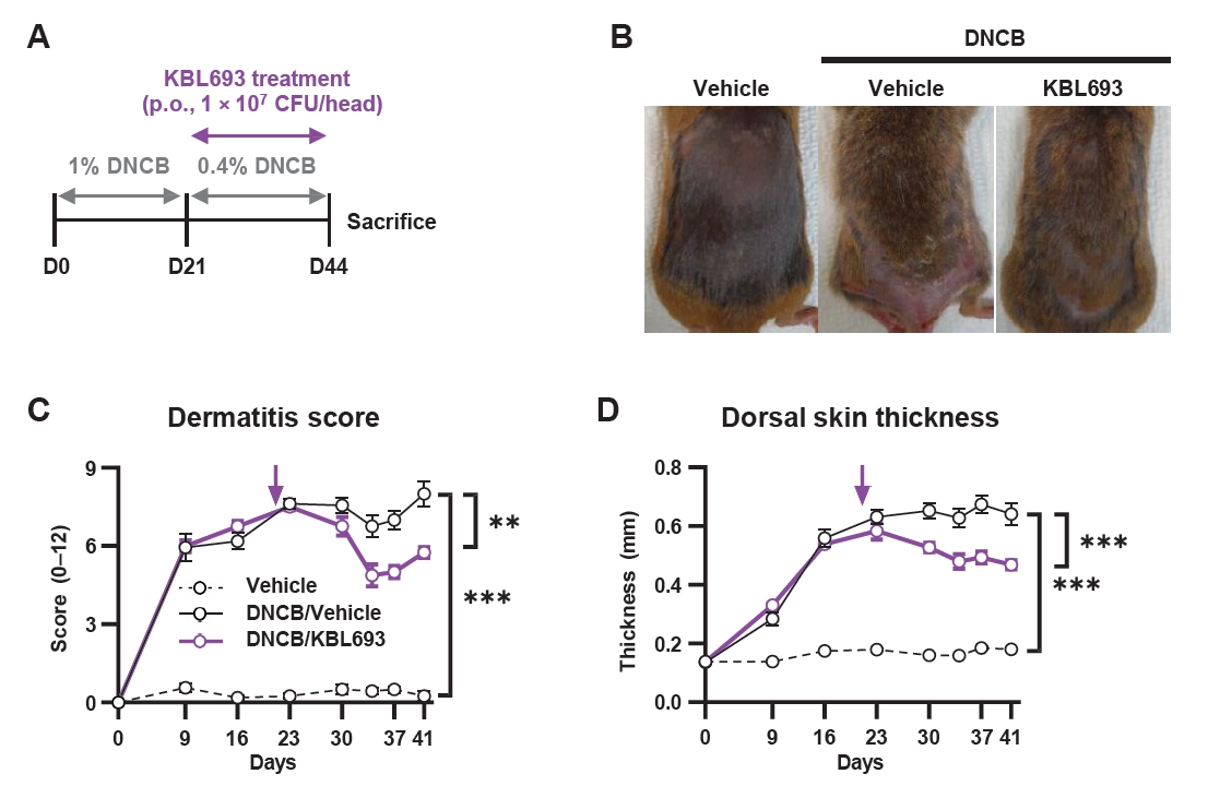 A DNCB-induced AD model was used to induce AD symptoms (Kim et al., 2018; Scott et al., 2002). DNCB solution (1%) was freshly prepared in a 3:1 mixture of acetone and olive oil and 200 μl was topically applied twice a week for 3 weeks. Subsequently, 0.4% DNCB solution, prepared in the same way, was applied until sacrifice. KBL693 was orally administered daily during the 0.4% DNCB period. A dose of 1 × 107 CFU/mouse was used for a marker analysis cohort, whereas 1 × 109 CFU/mouse was used for the immune cell analysis cohort. On day 44, all mice were sacrificed and plasma and skin tissues were collected from the marker analysis cohort, and mLNs were collected from the immune cell analysis cohort.