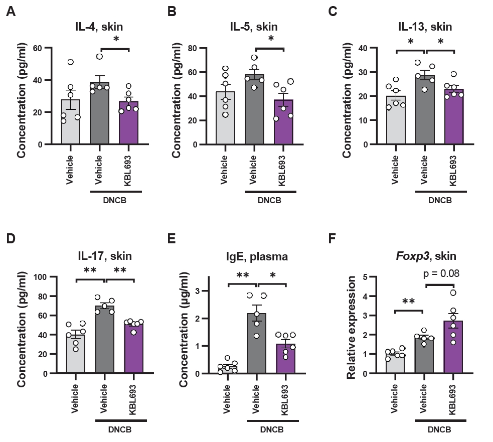 Fig. 3.Effects of KBL693 on type 2 immune biomarkers. (A–D) Cytokine levels in skin tissue, including IL-4 (A), IL-5 (B), IL-13 (C), and IL-17 (D). (E) IgE levels in plasma. (F) Relative expression of Foxp3 in skin tissue. Data are shown as the Mean ± SEM (n = 5–6/group). Statistical significance was determined by Student’s t-test (B, C) and Mann-Whitney U test (A, D–F) compared with DNCB/vehicle group (*, p < 0.05; **, p < 0.01; ***, p < 0.001).