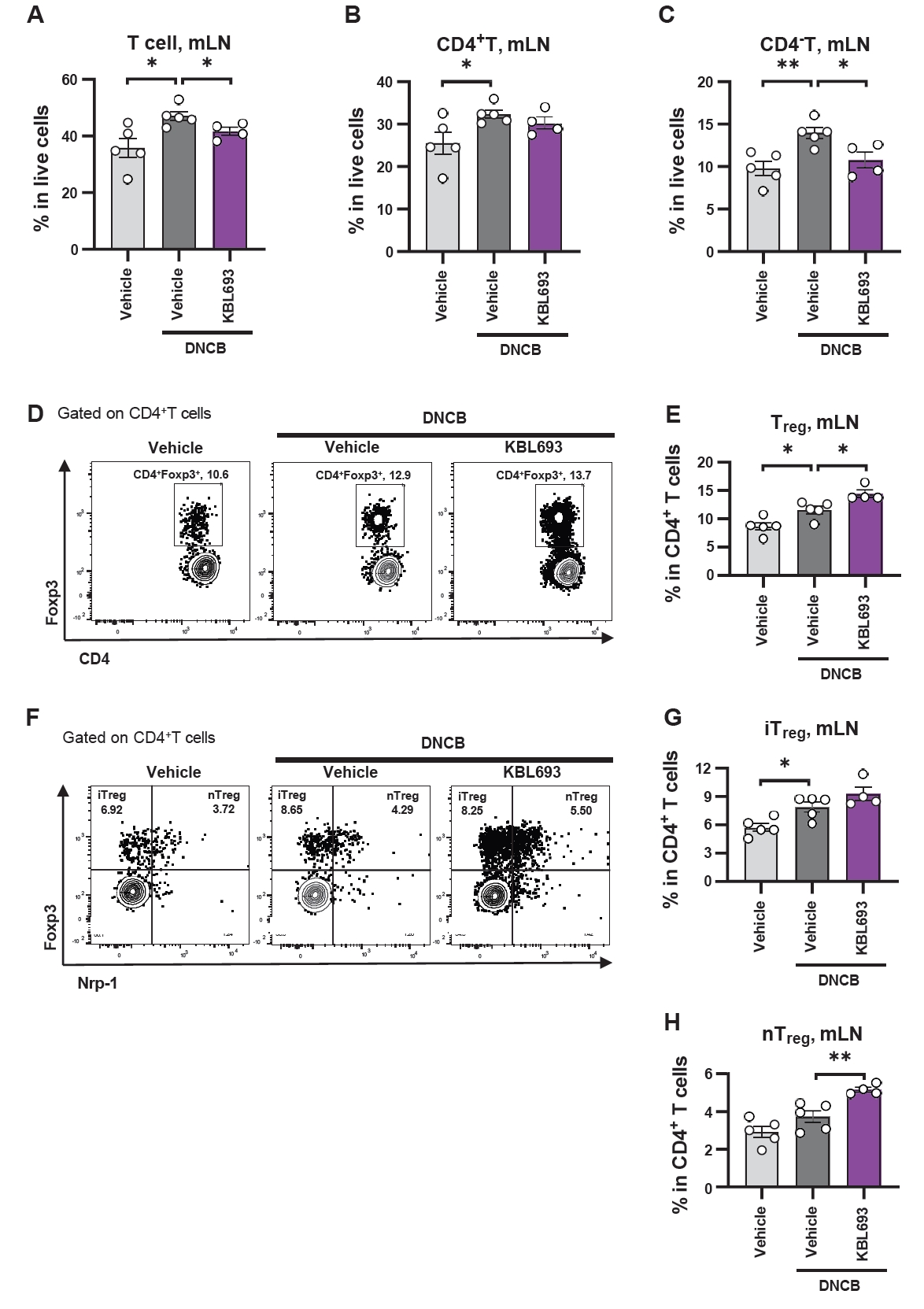 Increase of regulatory T cell counts in mesenteric lymph nodes by KBL693. (A–C, E, G, H) Absolute immune cell numbers, including total cells (A), T cells (B) CD4+ T cells (C), CD4- T cells (D), Tregs (E), iTregs (F), and nTregs (G). Data are shown as the Mean ± SEM (n = 4-5/group). Statistical significance was determined by Student’s t-test (A, C–G) and Mann-Whitney U test (B) compared with DNCB/vehicle group (*, p < 0.05; **, p < 0.01).