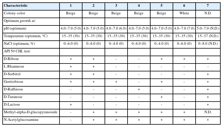 Fig. 1.Phylogenetic tree constructed based on 16S rRNA gene sequences of strains CBA3605T, CBA3606T, and other type strains of the genus Lactiplantibacillus using the neighbor-joining method. Bootstrap values based on 1,000 replicates are shown at the nodes, but only those exceeding 70.0% are displayed for the neighbor-joining, maximum-parsimony, and maximum-likelihood methods. Filled circles indicate nodes supported by all three treeing methods. Levilactobacillus tangyuanensis 137-3T (MK110859) was used as the outgroup. Scale bar represents 0.01 substitutions per nucleotide position.