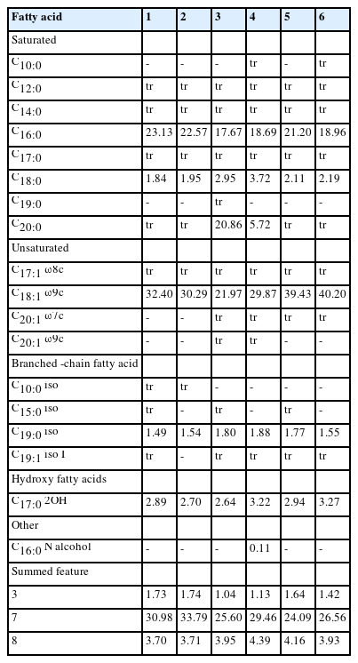 The predominant fatty acids of strains CBA3605T and CBA3606T, as well as the four closely related type strains, were C16:0, C18:1 ω9c, and Summed feature 7, which are typical for members of the genus Lactiplantibacillus. However, the relative proportions of these fatty acids varied among the strains. In particular, C18:1 ω9c was markedly higher in strains, 382-1T and WILCCON 0030T (39.4–40.2%) compared with strains CBA3605T, CBA3606T, 116-1AT, and Lp. nangangensis 381-7T (22.0–32.4%). Conversely, Summed feature 7 was most abundant in strains CBA3605T and CBA3606T (31.0–33.8%), but relatively lower in strains 382-1T and WILCCON 0030T (24.1–26.6%). C16:0 levels were relatively consistent (17.7–23.1%), although strains CBA3605T and CBA3606T showed slightly higher values than the others. These variations in fatty acid composition provide additional phenotypic evidence to differentiate the novel strains from their closest relatives.