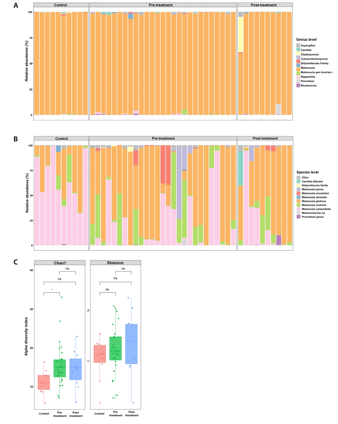 When stratified by doxycycline exposure, fungal communities remained Malassezia-dominant and exhibited substantial inter-individual variability. Relative abundance of dominant Malassezia species differed between untreated acne samples and samples obtained after doxycycline exposure; however, post-exposure profiles did not consistently resemble those of healthy controls (Fig. 1A and 1B). Post-exposure samples remained heterogeneous, and although several samples were positioned closer to the control centroid in ordination space, complete overlap was not observed. Chao1 richness in post-exposure samples was numerically higher and more variable than in controls; however, neither the post-exposure versus control comparison nor the direct pre-versus post-exposure comparison reached statistical significance (Fig. 1C).