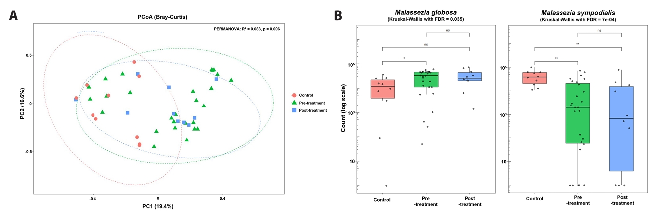 Alpha-diversity analysis (Fig. 1C) demonstrated significantly higher Chao1 richness in baseline acne samples compared with controls (p < 0.05), whereas Shannon diversity did not differ significantly between groups. Principal coordinates analysis of Bray–Curtis dissimilarities (Fig. 2A) revealed overall separation between acne and control samples (PERMANOVA, p = 0.006), indicating distinct fungal community structures. Analysis of dominant taxa (Fig. 2B) showed significantly higher abundance of M. globosa and lower abundance of M. sympodialis in baseline acne samples compared with controls (Kruskal–Wallis test with FDR correction: M. globosa FDR = 0.035; M. sympodialis FDR = 7 × 10-4).