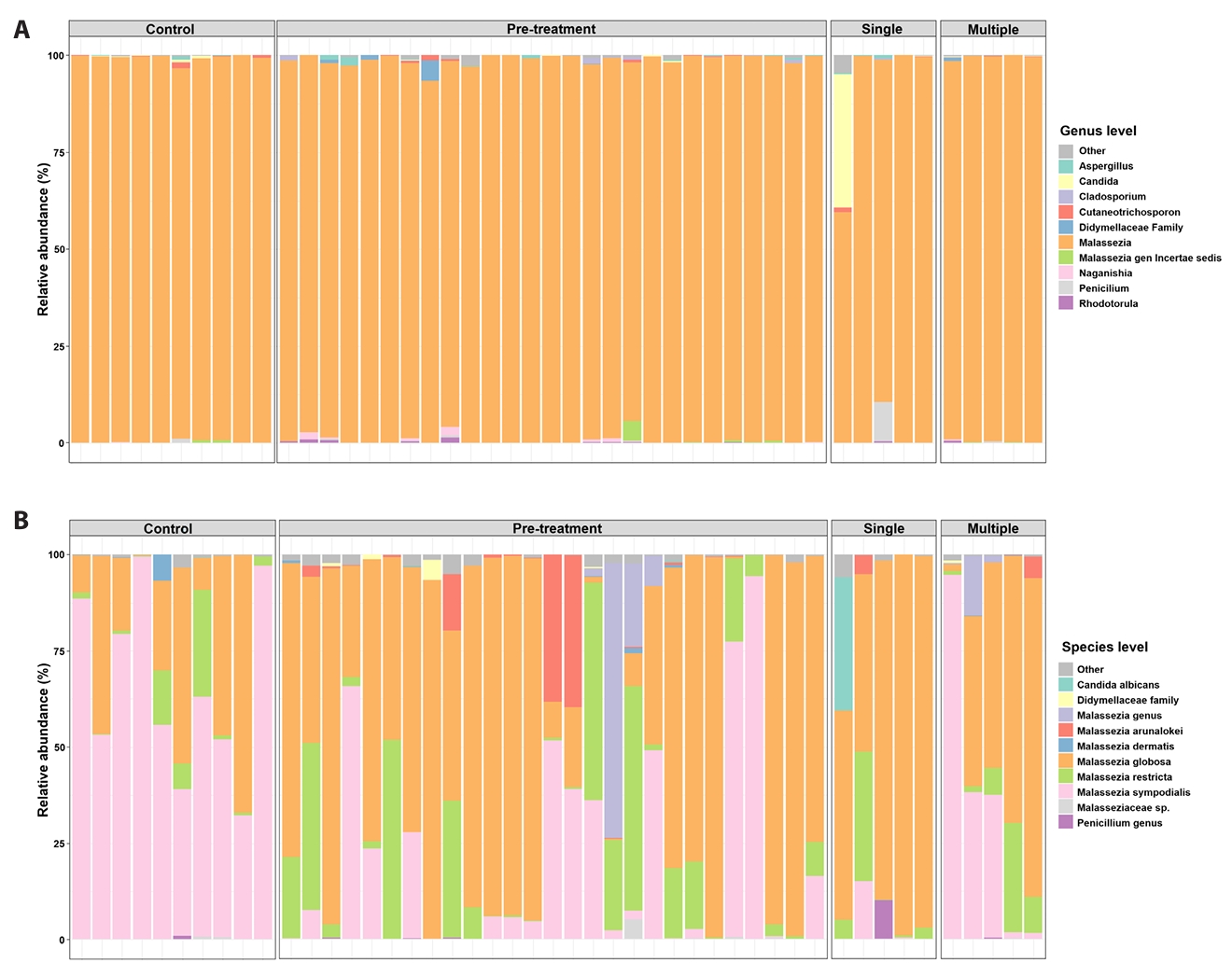 Fig. 3.Course-stratified species composition (single vs multiple courses). Species-level Malassezia composition stratified by doxycycline exposure history (single vs multiple courses) and controls. These exposure-stratified comparisons are descriptive and do not represent longitudinal recovery trajectories.