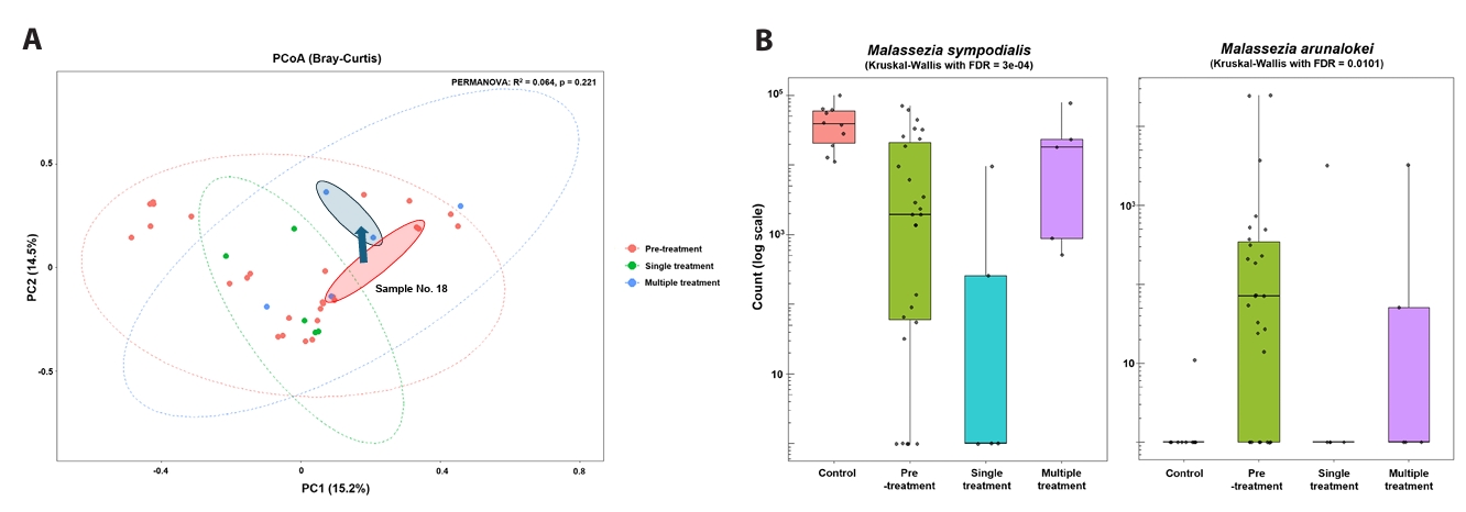 To further examine exposure-associated differences, post-exposure acne samples were stratified by doxycycline course number (single versus multiple) (Fig. 3A and 3B). Comparisons between single- and multiple-course exposure groups reflect descriptive, exposure-stratified cross-sectional patterns and should not be interpreted as evidence of treatment-induced recovery or confirmed temporal change (Figs. 3 and 4). Bray–Curtis PCoA did not demonstrate statistically significant global separation by exposure group (PERMANOVA, p = 0.221) (Fig. 4A). At the species level, samples from individuals exposed to a single course generally remained M. globosa–biased with relative depletion of M. sympodialis compared with controls, whereas samples from individuals exposed to multiple courses showed higher relative abundance of M. sympodialis and lower abundance of M. arunalokei (Fig. 3B). Across exposure groups, differences in M. sympodialis and M. arunalokei reached statistical significance; however, these findings should be interpreted as exposure-associated differences rather than evidence of longitudinal normalization. Collectively, these results indicate heterogeneous fungal community patterns associated with doxycycline exposure, without uniform convergence toward a control-like state (Fig. 4B).