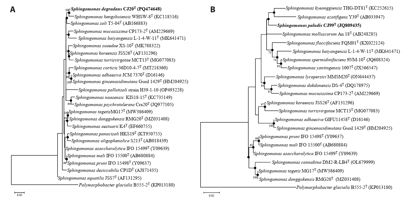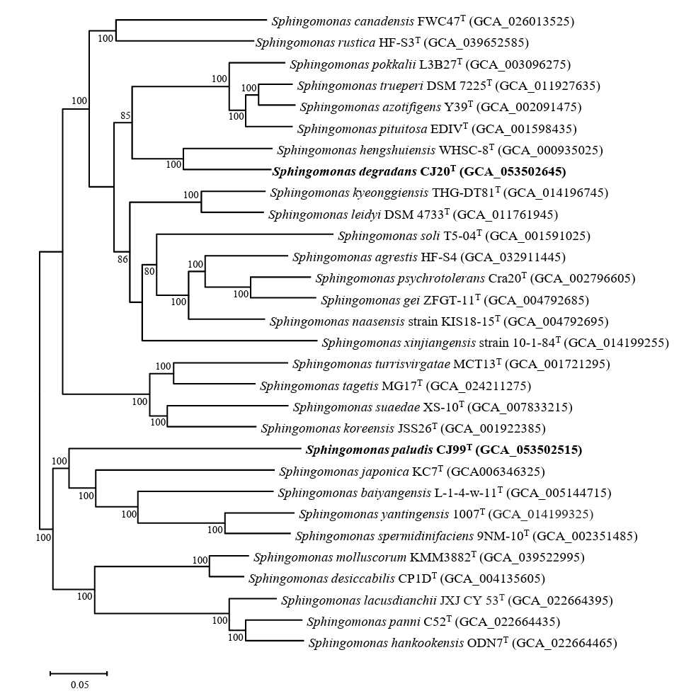 Based on the results from the phylogenetic analysis, strains CJ20T and CJ99T belong to the genus Sphingomonas. Chemotaxonomic and phenotypic characteristics, including respiratory quinone, profiles of polar lipid and fatty acid, and carbon source utilization, were concordant with the traits listed in the genus description. Some differential characteristics distinguished strains CJ20T and CJ99T from their related type strains. Strain CJ20T was positive for assimilation of N-acetyl-glucosamine, whereas its related type strains were negative. Strain CJ99T assimilated potassium gluconate and adipic acid, while its related type strains did not. For the genomic analysis, low dDDH (< 70%) and ANI values (< 95–96%) precisely differentiated strains CJ20T and CJ99T from their closely related type strains. Therefore, strains CJ20T and CJ99T represent a novel species of the genus Sphingomonas, for which the names Sphingomonas degradans sp. nov. and Sphingomonas paludis sp. nov. are proposed, respectively.