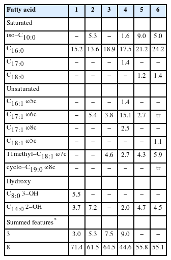 The polar lipids of strain CJ20T and CJ99T were extracted from 100 mg of freeze-dried cells cultured in TSA during two days at 30°C and analyzed by two-dimensional silica gel thin-layer chromatography (TLC) (Minnikin et al., 1984). Two types of solvents were used for two-dimensional TLC: a mixture of chloroform:methanol:water (32.5:12.5:2, v/v/v) was used for the first dimension of separation and a mixture of chloroform:methanol:acetic acid:water (40:6:7.5:2, v/v/v/v) was used for the second dimension. Total lipids were detected with 5% (w/v) phosphomolybdic acid, aminolipids with 0.25% (w/v) ninhydrin, phospholipids with molybdenum blue spray and glycolipids with 15% (w/v) α-naphthol. Respiratory quinone was extracted as described by Minnikin et al. (1984) and analyzed by high-performance liquid chromatography using a reverse phase column (Apollo C18, 250 × 4.6 mm, 5 μm) (Collins, 1985). Respiratory quinones were dissolved in chloroform:methanol (2:1, v/v) and eluted by a mixture of methanol:2-propanol (1:1, v/v) with a flow rate of 1 ml/min and detected at 275 nm. To extract fatty acids, both strains were incubated in TSB at 30℃ and harvested at the mid-exponential growth phase. The harvested cells were saponified, methylated, and extracted and analyzed by gas chromatography following the instructions of the Sherlock Microbial Identification System (MIDI) version 6.2 and identified by using the RTSBA6 database (Sasser, 1990).