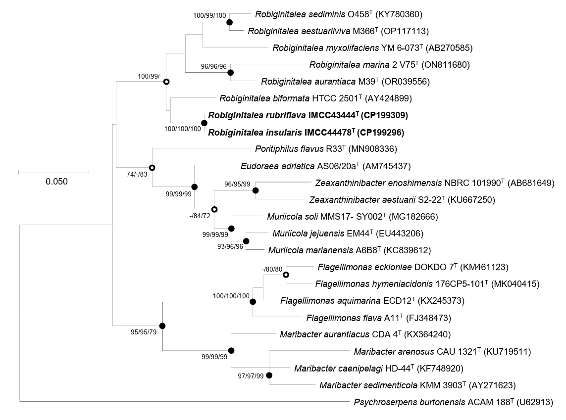 Fig. 1.Maximum-likelihood phylogenetic tree based on 16S rRNA gene sequences showing the phylogenetic placement of strains IMCC43444T and IMCC44478T. Bootstrap support values (≥ 70%) from the maximum-likelihood, neighbor-joining, and minimum-evolution methods (in that order) are shown at the corresponding nodes. Closed circles indicate nodes recovered by all three tree-building methods, whereas open circles denote nodes supported by two of the three methods. The 16S rRNA gene sequences of strains IMCC43444T and IMCC44478T used for tree reconstruction were derived from the complete genome sequences. Scale bar, nucleotide substitutions per site.