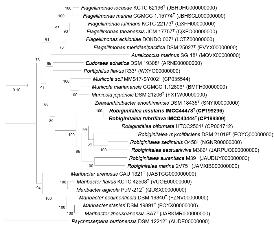 Coastal waters of the Korean Peninsula are recognized as biologically dynamic systems that harbor a substantial reservoir of uncharacterized microbial lineages, and numerous novel bacterial taxa have indeed been intermittently isolated and described from these environments in recent years (Han et al., 2025; Kim et al., 2025; Lee et al., 2024; Tak et al., 2024; Yang et al., 2024). As part of our ongoing investigation into marine bacterial diversity, we characterized strains IMCC43444T and IMCC44478T, which were isolated from coastal surface seawater off two islands in the Yellow Sea during a survey of prokaryotic diversity in island-associated marine habitats. Comprehensive analyses of their physiological, phylogenetic, chemotaxonomic, and genomic characteristics supported the conclusion that each of the two strains represents a novel species within the genus Robiginitalea.