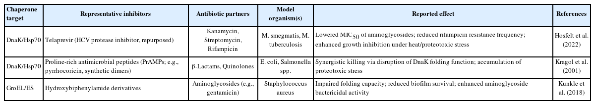 | Chaperone target | Representative inhibitors | Antibiotic partners | Model organism(s) | Reported effect | References |