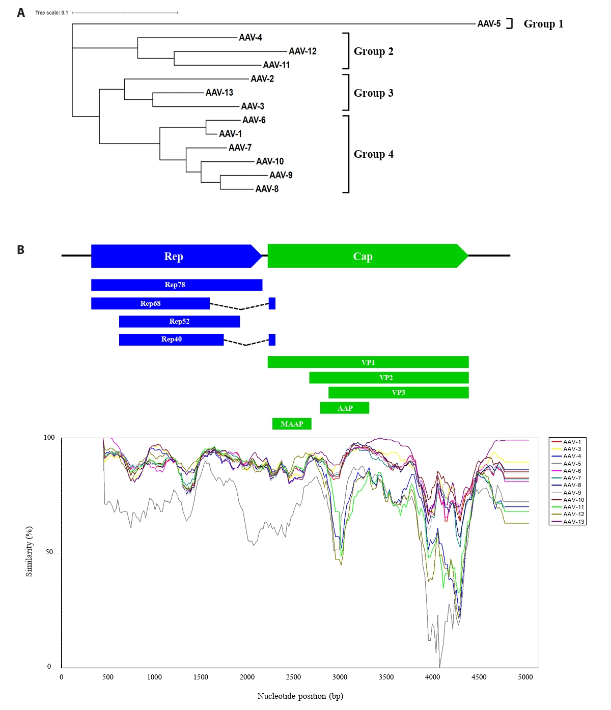 Fig. 1.Phylogenetic tree and DNA sequence similarity analysis of the whole genome sequence of 13 AAVs. (A) A phylogenetic tree analysis of the AAV whole genome was performed using the maximum likelihood (ML) method in the MEGA 11 program (http://www.megasoftware.net/). (B) Similarity of 13 AAVs was analyzed with window 200 bp, step whole genome sequence of 13 AAVs was analyzed with a window of 200 bp, a step of 20 bp, Kimura (2-parameter), and AAV-2 serves as the query sequence. The X-axis and Y-axis represent nucleotide positions and percentage of sequence similarity, respectively. Positions of each gene based on AAV-2 are shown at the top of the graph.