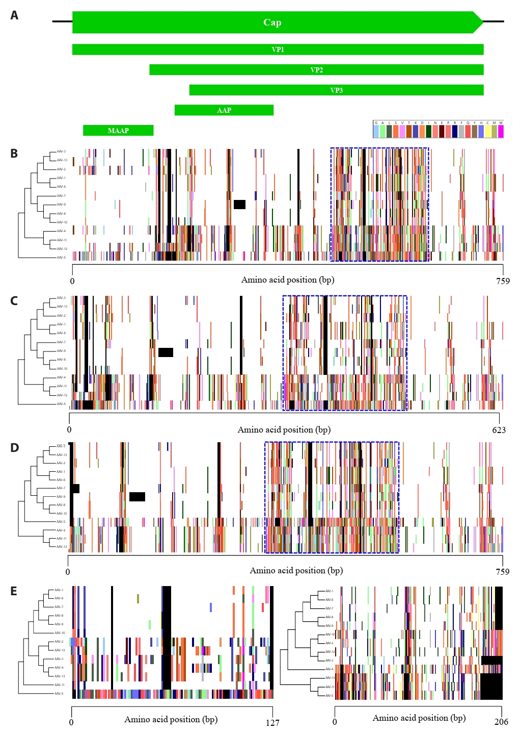 Fig. 2.Proteotyping analysis based on the amino acid sequence of 5 transcription units in the Cap gene. (A) Map of the Cap gene. (B) VP1. (C) VP2. (D) VP3. (E) MAAP and AAP. The maximum likelihood phylogenetic tree for each protein (Left) is shown. The color assigned to each amino acid is indicated top. The blank and consensus sequences are represented in black and white, respectively. The hypervariable regions of VP1, VP2, and VP3 amino acid sequences are highlighted with blue dashed boxes.