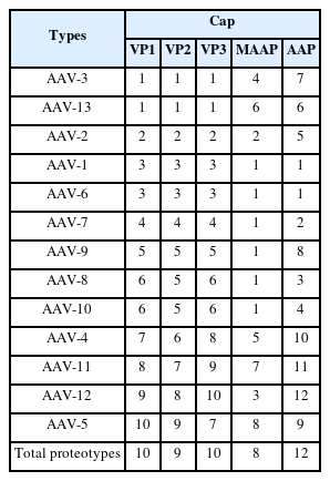Table 2.The proteotypes of the nine open reading frames (ORFs) across 13 AAV serotypes are indicated by numerical codes, with each proteotype distinctly color-coded. Rows are organized according to VP1, while columns follow the linear order of ORFs arranged from the 5′ to 3′ end of the AAV genome.