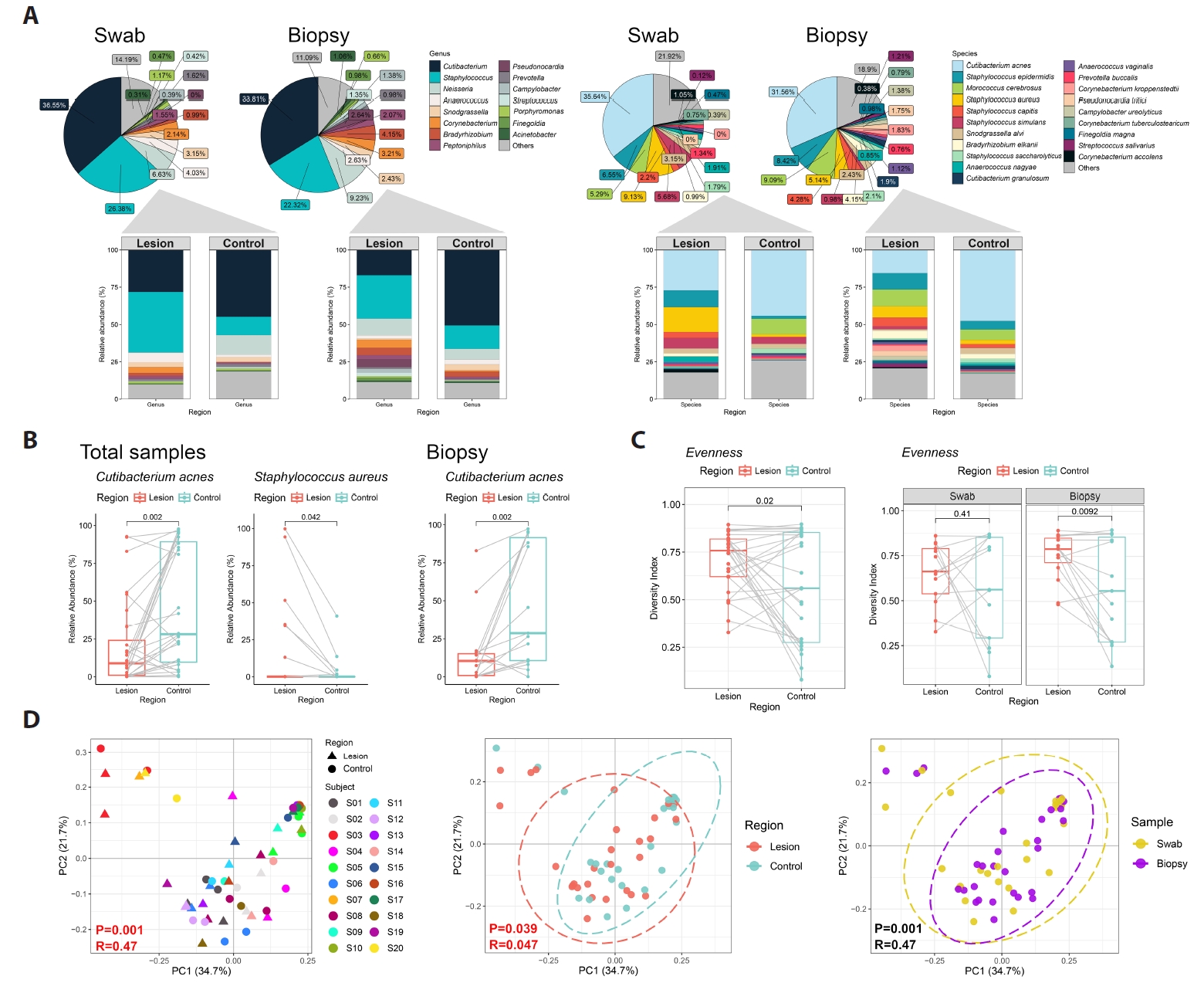 Microbial evenness tended to be higher in lesions, whereas richness showed no consistent difference (Fig. 1C).