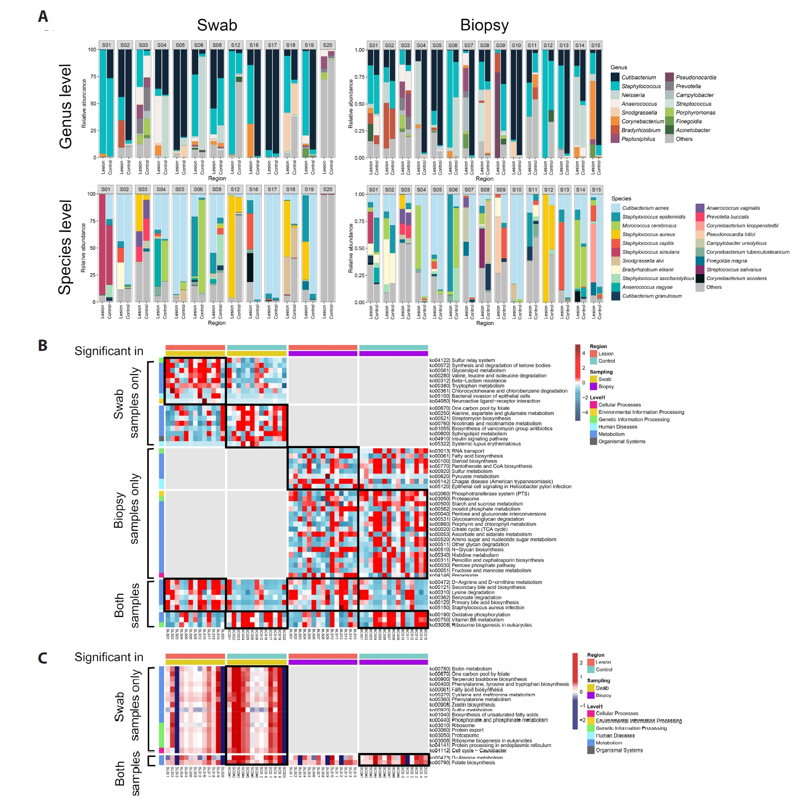 Fig. 2.Microbiota composition and predicted functional profiles in BCC. (A) Relative abundance of the most prevalent bacterial genera and species in swab (n = 13 pairs) and biopsy (n = 15 pairs) datasets. (B) Predicted metagenomic functional pathways (PICRUSt2) showing the top differentially abundant KEGG pathways between BCC lesions and controls. (C) Comparison of C. acnes–associated KEGG pathway proportions between BCC lesions and controls.
