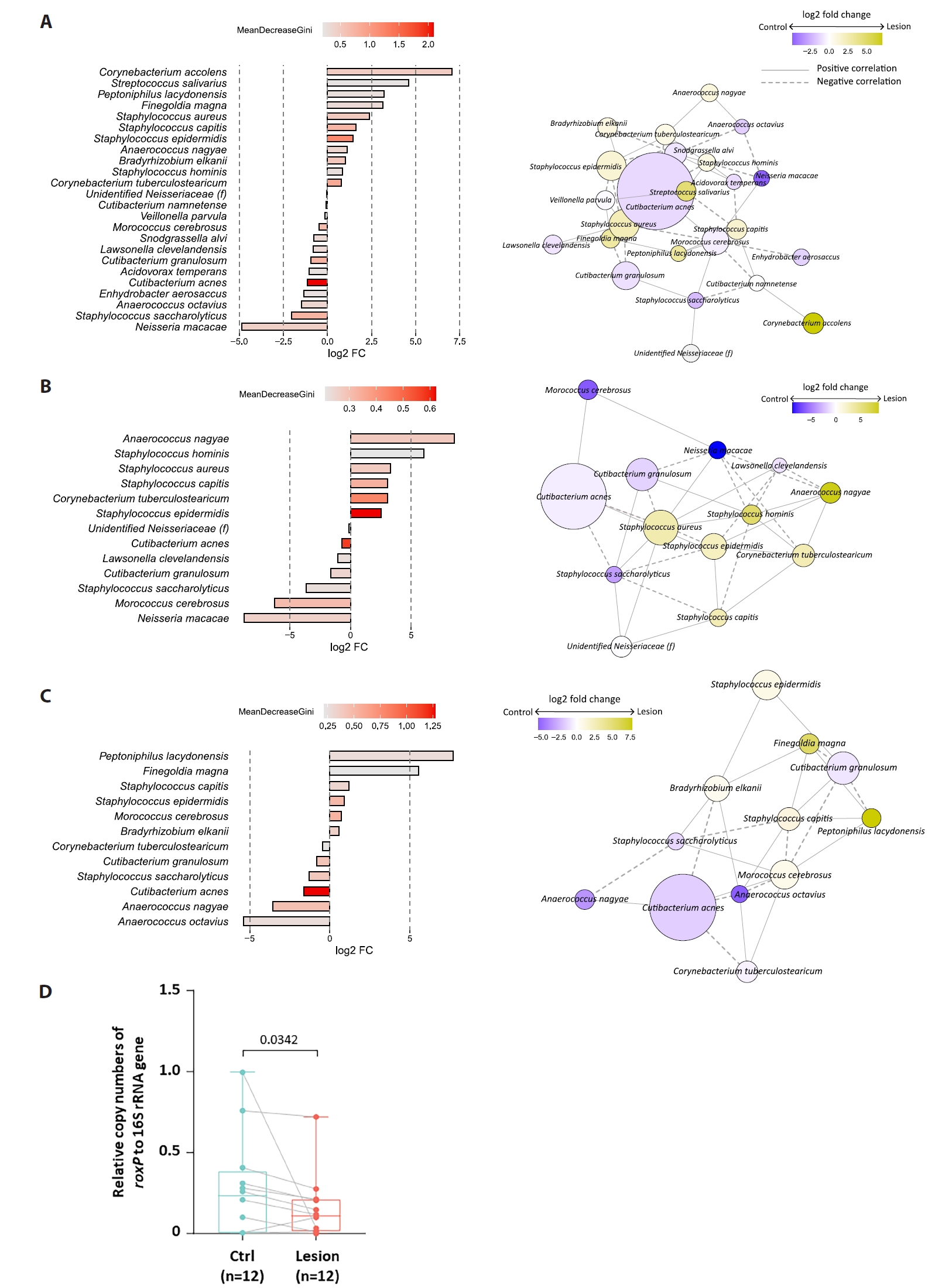Fig. 3.Discriminatory taxa and roxP antioxidant gene quantification in BCC. (A–C) Random forest analysis identifying the top 24 taxa (mean decrease Gini ≥ 0.2) distinguishing BCC lesions from controls in the total dataset (A), swab dataset (B), and biopsy dataset (C). Right panels: co-occurrence networks of amplicon sequence variants (ASVs) selected by random forest. Edges represent significant SparCC correlations (P < 0.05), with solid lines indicating positive and dashed lines indicating negative associations. Node size and color represent log₂ fold change between BCC and control. (D) Absolute quantification of the roxP gene (Radical oxygenase of Propionibacterium acnes) in swab samples (n = 12 pairs), expressed as the ratio of roxP to 16S rRNA copy number. Differences assessed by paired Wilcoxon signed-rank test; P < 0.05.