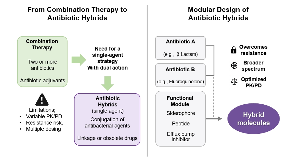 Antibiotic hybrids are a novel class of therapeutics generally defined as conjugation products of two distinct antimicrobial agents (Fig. 1). This approach has emerged as a promising solution to the challenges posed by traditional combination therapies (Domalaon et al., 2018). The term ‘dual-action antibiotics’ was initially used to describe this class of antibiotics; however, it has been replaced by ‘antibiotic hybrids.’ Upon administration, antibiotic hybrids are considered a single agent, offering several advantages over combination therapy in assessing pharmacokinetics (PK), pharmacodynamics (PD), and dose optimization for clinical trials. Recently, the scope of antibiotic hybrids has been extended to include the integration of functional modules with antibiotics. Functional modules are defined as any molecules that exert biological actions on bacteria, such as siderophores, which are used for iron uptake in prokaryotes, and cationic peptides, which disrupt bacterial membranes. The bimodality of antibiotic hybrid compounds restores the effectiveness of antibiotics that have become obsolete owing to high resistance. Additionally, antibiotics previously limited to Gram-positive bacteria due to poor permeability can be redesigned for use against Gram-negative bacteria with the proper design of hybrid compounds. The antibiotic hybrid strategy is based on clinically proven antimicrobial compounds, enabling rapid development of new antibiotics through the combination of drugs or functional molecules.