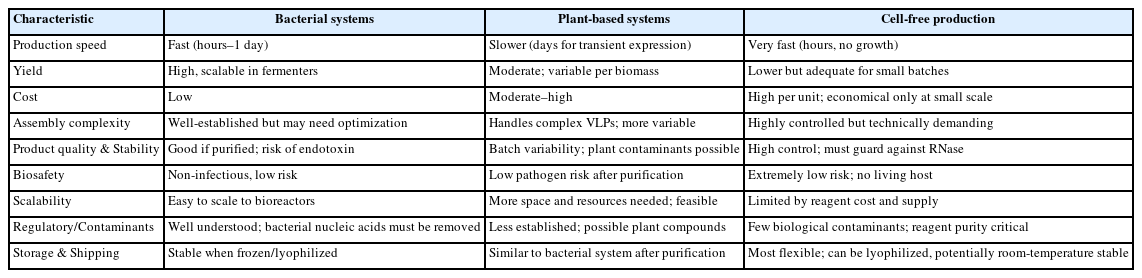 | Characteristic | Bacterial systems | Plant-based systems | Cell-free production |