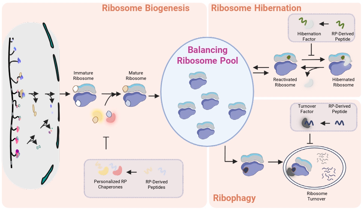 Fig. 1.Schematic view illustrating how cells maintain ribosome homeostasis and strategies to disrupt by RP-derived peptides. Three key processes that balance the active ribosome pool are depicted. Ribosome biogenesis involves stepwise maturation through the incorporation of ribosomal proteins, many of which require personalized RP chaperones for proper delivery and assembly. Disruption of these chaperones impairs RP incorporation, ultimately leading to an insufficient number of functional ribosomes. Ribosome hibernation depends on specific hibernation factors that regulate ribosome activity under stress conditions; inactivation of these factors results in inefficient control of ribosome pool balance. Ribophagy selectively degrades ribosomes in response to specific stress, and disruption of ribosome turnover factors leads to dysregulated stress responses and impaired ribosome homeostasis.