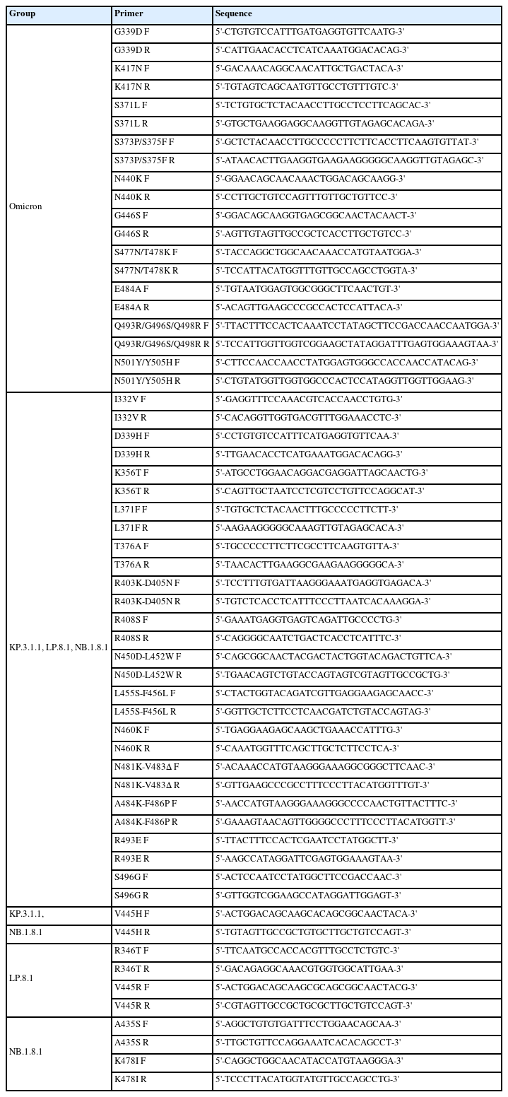 | KP.3.1.1, LP.8.1, NB.1.8.1 | I332V F | 5′-GAGGTTTCCAAACGTCACCAACCTGTG-3′ |