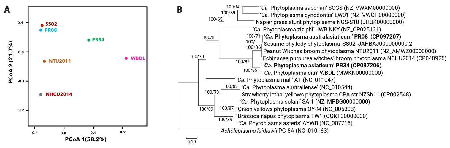 Principal Coordinate Analysis (PCoA) based on pairwise comparisons of 476 genes of six phytoplasma genomes within the PWB (16SrII) group viz. ‘Ca. P. asiaticum’ PR34, ‘Ca. P. citri’ WBDL, ‘Ca. P. australasiaticum’ PR08, SS02, and NCHU2014, and NTU2011 (Peanut Witches’ Broom) which revealed five distinct clusters. Five distinct genomic clusters were observed among the analyzed PWB phytoplasma genomes, with PR34 forming an outlying group. Notably, Indian-origin isolates of ‘Ca. P. australasiaticum’, such as PR08 and SS02, clustered separately, suggesting regional genomic diversification within the lineage (Fig. 2A). PCoA, which reflects overall genomic dissimilarity, thus suggested substantial divergence of PR34 from other PWB phytoplasmas. This clustering pattern identified by PCoA was independently validated by phylogenetic analyses. Nearly full-length 16S rRNA gene-based phylogeny placed PR34 in a distinct clade, separate from ‘Ca. P. citri’ (WBDL) and ‘Ca. P. australasiaticum’ (PR08) (Fig. S2). Phylogenetic trees based on whole-genome metrics (Fig. 2B) and concatenated housekeeping genes (Fig. S3) support the distinction of PR34 and PR08 as separate subclades within the 16SrII group and indicate divergent evolutionary paths characterized by strain-specific mobile element profiles and gene content reduction.