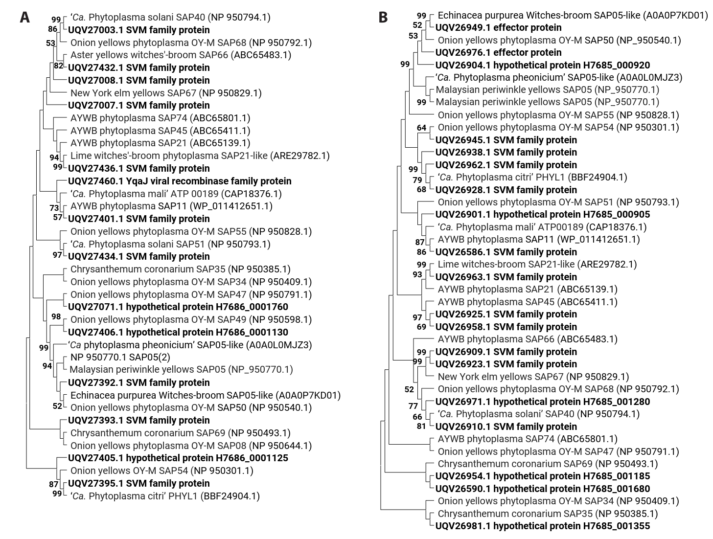 Phylogenetic analyses provided further support for these assignments. Effector proteins from PR08 and PR34 clustered within canonical SAP families, while also revealing lineage-specific divergence (Fig. 3A and 3B). In PR34, the SAP11 homolog (UQV27401) grouped with shoot proliferation-associated variants from AYWB and ‘Ca. P. mali’, diverging from homologs in ‘Ca. P. citri’ (WBDL) and ‘Ca. P. australasiaticum’ (PR08), suggesting host-range adaptation. SAP54-like proteins UQV27395 and UQV27405 in PR34 clustered within the phyllody-associated clade but remained distinct from PHYL1 of ‘Ca. P. citri’ and OY-M. Similarly, UQV27406.1 and UQV27392 clustered with SAP05 proteins from ‘Ca. P. asteris’ and OY-M. In PR08, three homologs (UQV26949.1, UQV26976.1, UQV26904.1) aligned with SAP05-, SAP50-, and SAP55-like proteins from aster yellows phytoplasmas. Additional SAP11-related proteins (UQV26586.1, UQV26901.1) retained ~41% identity to AYWB and ‘Ca. P. mali’. SAP54-like candidates (UQV26945.1, UQV26938.1, UQV26962.1) grouped with the floral virescence-associated family. These clustering patterns indicate that while PR08 and PR34 maintain the canonical phytoplasma effector toolkit, their repertoires diverge in lineage-specific ways.