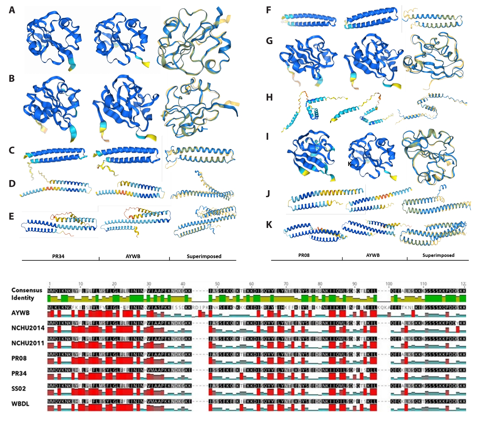 Structural analyses added an additional layer of validation. Comparative alignments and AlphaFold2-based structural predictions of SAP05, SAP11, SAP54 (PHYL1), SAP15, SAP19, SAP21-like, and SAP49 homologs from PR08 and PR34 revealed strong conservation of α/β folds across strains (Fig. 4). Foldseek-based comparisons confirmed near-identical structural cores, particularly across α-helices and β-sheets, with low RMSD values ranging from 0.40 to 0.71 Å across multiple effector–crystal structure pairings, supporting robust fold conservation despite modest sequence divergence. Deviations were largely confined to loop regions, which are structural elements often implicated in host protein–protein interactions. AlphaFold2 models of SAP11, SAP05, and SAP54 showed consistently high pLDDT scores across the conserved helical core (> 85–90), indicating high confidence in the predicted folds, while lower confidence was restricted to signal peptides and terminal regions. For example, PR34 and PR08 SAP05 and SAP54 homologs each showed low RMSD values (< 0.75 Å) when superimposed on their respective reference crystal structures, supporting strong fold conservation (Fig. 4). In SAP05, for example, subtle loop variability could influence binding to the plant ubiquitin–proteasome system, while the PR34 SAP11 homolog closely mirrored AYWB SAP11 in hydrophobicity profiles and overall fold, suggesting functional mimicry of TCP-binding activity (Fig. 4). These models therefore provide reliable structural context for effector conservation, although functional interactions remain to be experimentally validated.