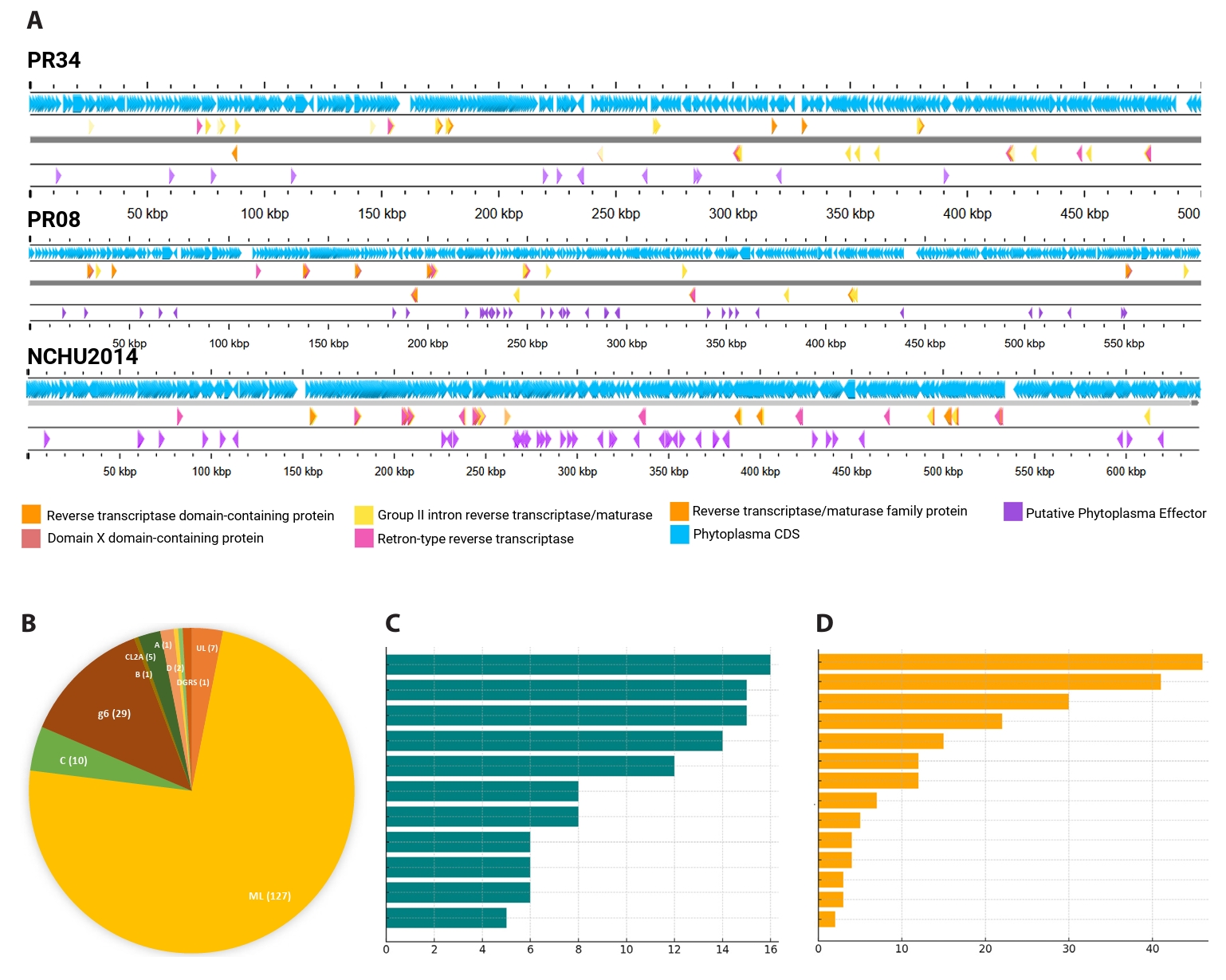 A survey of available phytoplasma genomes confirmed that prolific intron content is characteristic of the peanut witches’ broom (PWB; 16SrII) lineage. Every examined 16SrII genome carried multiple introns, whereas most other phytoplasmas contained none or at most one. A few non-PWB strains, including ‘Ca. P. solani’ 231/09, Mulberry dwarf, and ‘Ca. P. australiense’ SLY, contained more than one, with SLY carrying eight ltrA-like ORFs, five of them fragmented (Luo et al., 2022; Music et al., 2019). Thus, the intron proliferation observed in PR34 and PR08 is not a general property of phytoplasmas but a lineage-specific expansion within PWB strains (Fig. 5C, Table S3).