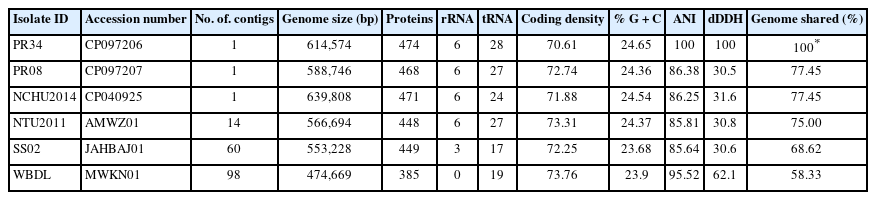 Phylogenetic placement of PR08 and PR34 was assessed using MEGA12 (Kumar et al., 2024) with Neighbor-Joining, Maximum-Likelihood, and Maximum-Parsimony analyses of 16S rRNA gene sequences. Whole genome based phylogeny was performed using core genes identified by BPGA (Chaudhari et al., 2016), and 89 conserved marker genes from UBCG (Na et al., 2018), with HMMER searches (Potter et al., 2018) for marker detection. To validate genome-based placement, additional trees were constructed using five informative marker genes: [replication initiation protein DnaD (dnaD), DegV family protein (degV), TIGR00282 family metallophosphoesterase, preprotein translocase SecY (secY), and RluA family pseudo-uridine synthase (rluA)] (Cho et al., 2020).