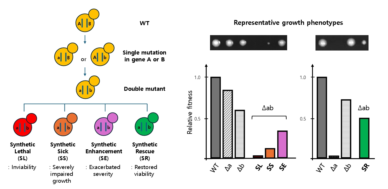 Fig. 1.Schematic overview of genetic interaction outcomes in S. cerevisiae. Starting from a wild-type genotype (A|B), single mutations in either gene (a|B or A|b) reduce fitness or growth. When both mutations are combined (a|b), the resulting double mutant exhibits one of four outcomes: synthetic lethality (SL, red; inviability), synthetic sickness (SS, orange; severely impaired growth), synthetic enhancement (SE, purple; exacerbated severity), or synthetic rescue (SR, green; restored viability). These interactions are visualized via representative growth phenotypes (top images) and quantified as relative fitness (bottom bar graphs). This conceptual diagram illustrates how the combination of mutations can lead to either network collapse or compensatory recovery, revealing the dual nature of fragility and robustness in genetic systems. The relative fitness scale represents the normalized growth phenotype (typically colony size or exponential growth rate) relative to the wild type (set to 1.0). A fitness value of 0 indicates lethality, while 1 indicates wild-type growth.