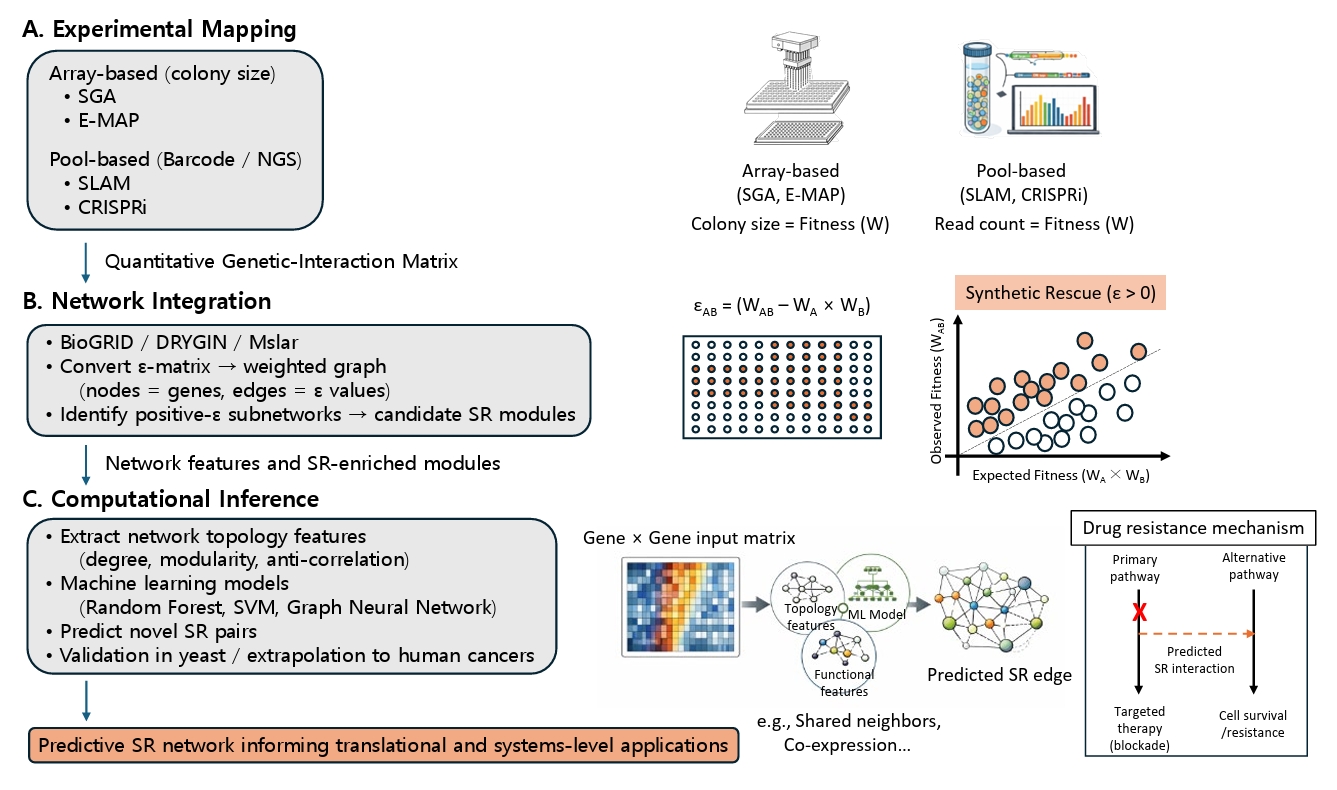 At the computational level, SR prediction is entering an era of data-driven synthesis. Traditional epistasis scoring, while foundational, provides only a static snapshot of interaction strength. The next step is to embed SR into dynamic network models where interaction strength evolves with context (Barabási and Oltvai, 2004). Graph-learning algorithms and probabilistic network inference can combine genetic, expression, and metabolomic data to identify compensatory motifs that anticipate rescue behavior (Zhu et al., 2023). Training these models across species, using yeast as the baseline and mammalian systems as validation, will reveal conserved patterns of adaptability. Such cross-domain learning can ultimately convert SR mapping from descriptive genetics into predictive network medicine, capable of forecasting how a cell or tumor will reorganize in response to stress or therapy (Rancati et al., 2018).