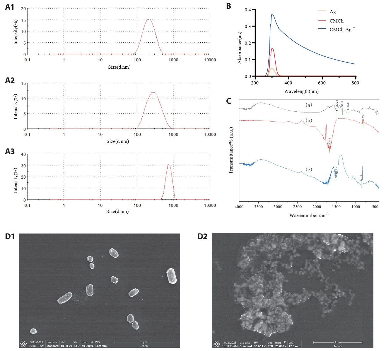 Fig. 1.Characterization of CMCh-Ag⁺ complexes. (A) Size distribution of the composite materials; (A1) Size distribution of Ag⁺; (A2) Size distribution of CMCh; (A3) Size distribution of CMCh-Ag⁺; (B) Ultraviolet absorption spectrum of the complex within the range of 200–800 nm; (C) Fourier transform infrared (FTIR) absorption spectra of CMCh (a), Ag⁺ (b), and CMCh-Ag⁺ (c). (D) Scanning electron microscopy images of CMCh (D1) and CMCh-Ag⁺ (D2).