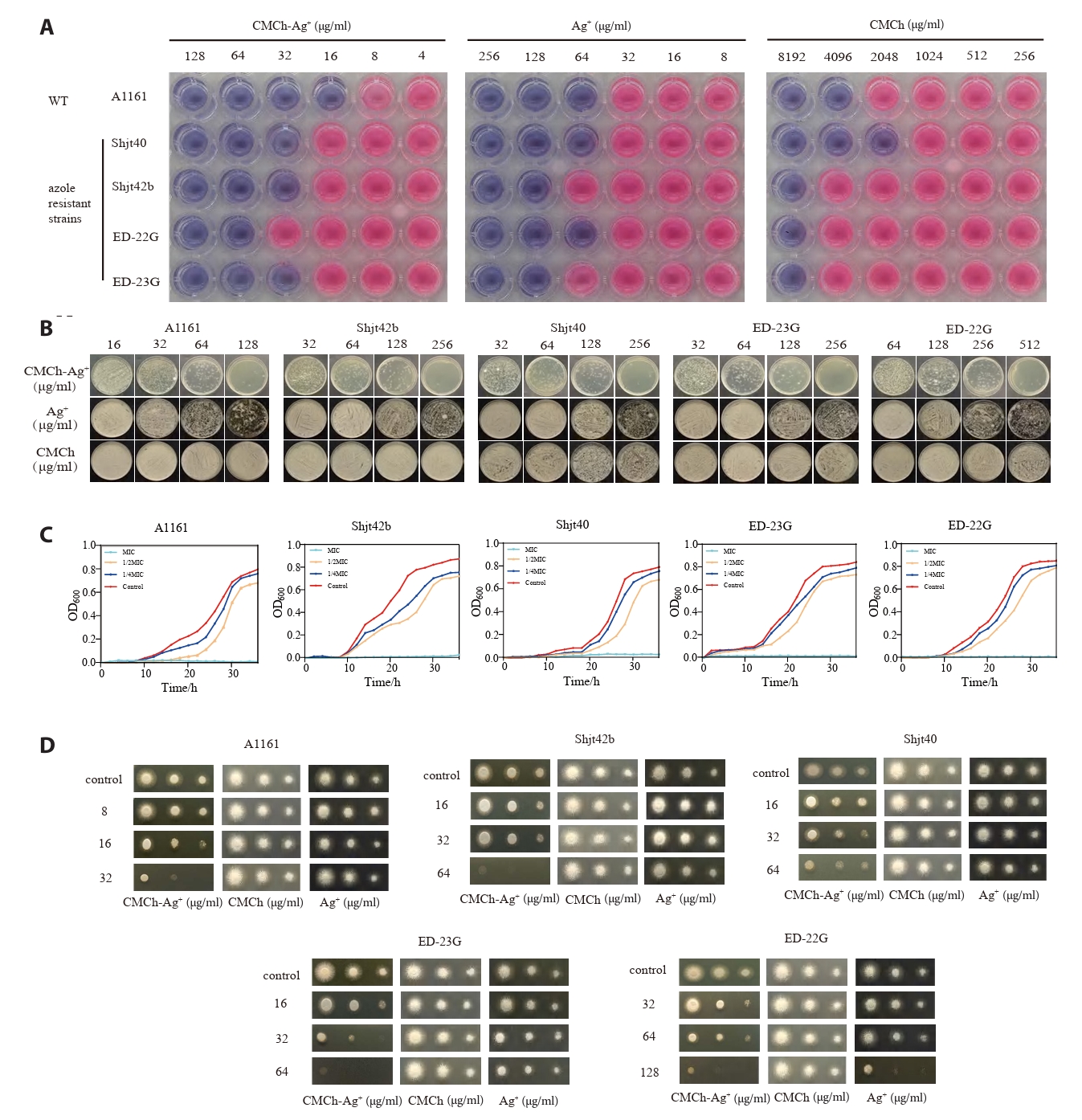 Fig. 2.Research on the in vitro antimicrobial properties of the agents. (A) MICs of CMCh-Ag⁺, Ag⁺, and CMCh against five strains of A. fumigatus. In each group of pictures, medium blue represents no metabolic activity, and pink purple represents high metabolic activity. (B) MFCs of CMCh-Ag⁺, Ag⁺, and CMCh against five strains of A. fumigatus. (C) Fungal growth curves were generated by measuring OD600 via a microplate reader for different concentrations of CMCh-Ag⁺ in A. fumigatus liquid cultures over a period of 36 h, with measurements taken every 2 h. (D) Plate culture experiment. In sterilized MM agar medium, five strains of A. fumigatus suspensions (1 × 108 CFU/ml, 1 × 107 CFU/ml, and 1 × 106 CFU/ml) were added to a volume of 2 μl each. The cultures were incubated for 24 h.