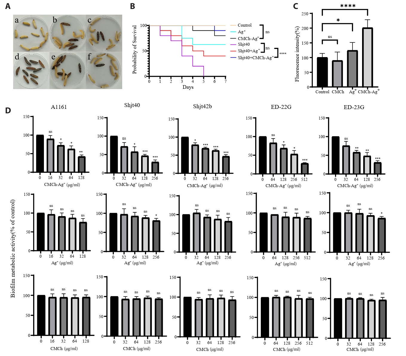 Fig. 3.Antifungal and biofilm-removing functions of CMCh-Ag⁺ composite validated in G. mellonella and drug-resistant A. fumigatus. (A) antimicrobial experiment on G. mellonella larvae. (a) Physiological saline group; (b) Ag⁺ treatment group; (c) CMCh-Ag⁺ agent treatment group; (d) ED-23G fungal treatment group; (e) ED-23G mixed with Ag⁺ treatment group; (f) ED-23G mixed with CMCh-Ag⁺ treatment group. Dead individuals are dark brown, and surviving individuals are white. (B) Survival curve of G. mellonella larvae. ****, p < 0.0001; ns, p > 0.05 according to log rank analysis. (C) Effects of CMCh, Ag⁺, and CMCh-Ag⁺ on intracellular ROS levels in drug-resistant A. fumigatus (strain ED-23G). Fluorescence intensity reflects intracellular ROS concentration. ns, p > 0.05; **, p < 0.01; ****, p < 0.0001 according to log rank analysis. (D) Valuation of the biofilm clearance efficacy of three different agents against five strains of A. fumigatus at various concentrations. OD600 was measured via a microplate reader following crystal violet staining. *, p < 0.1; **, p < 0.01; ***, p < 0.001; ns, p > 0.05 according to log rank analysis.