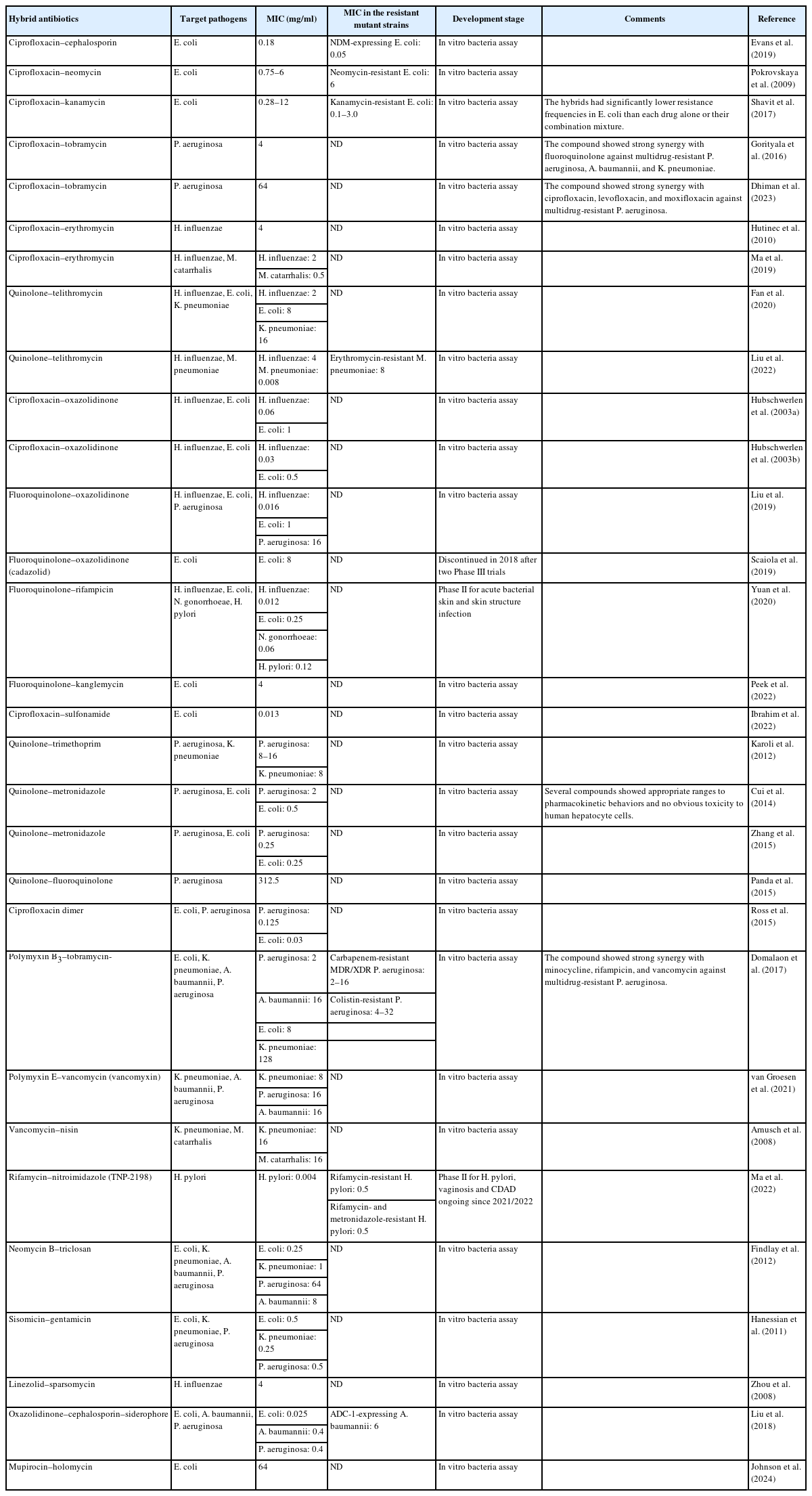 | Hybrid antibiotics | Target pathogens | MIC (mg/ml) | MIC in the resistant mutant strains | Development stage | Comments | Reference |