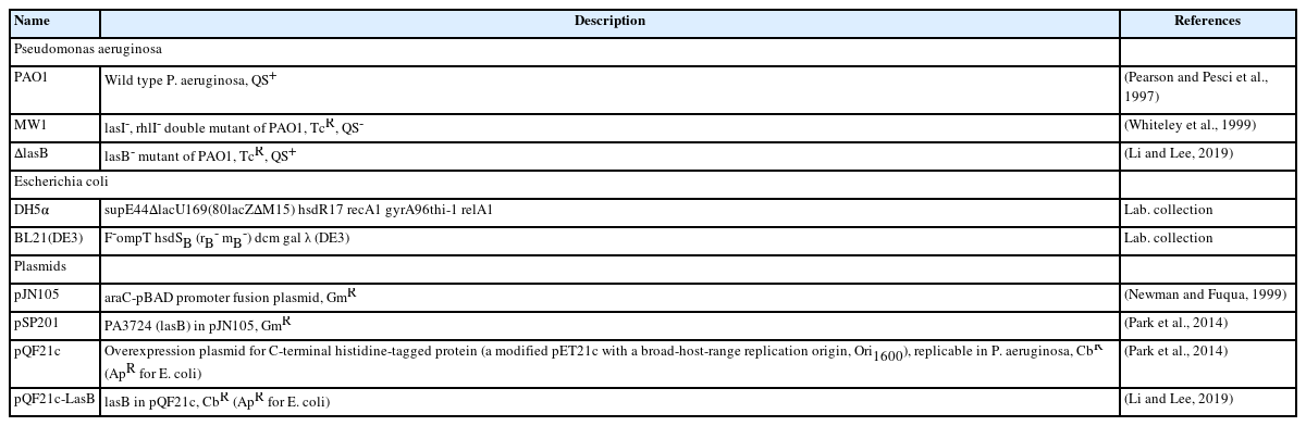 | ΔlasB | lasB- mutant of PAO1, TcR, QS+ | (Li and Lee, 2019) |