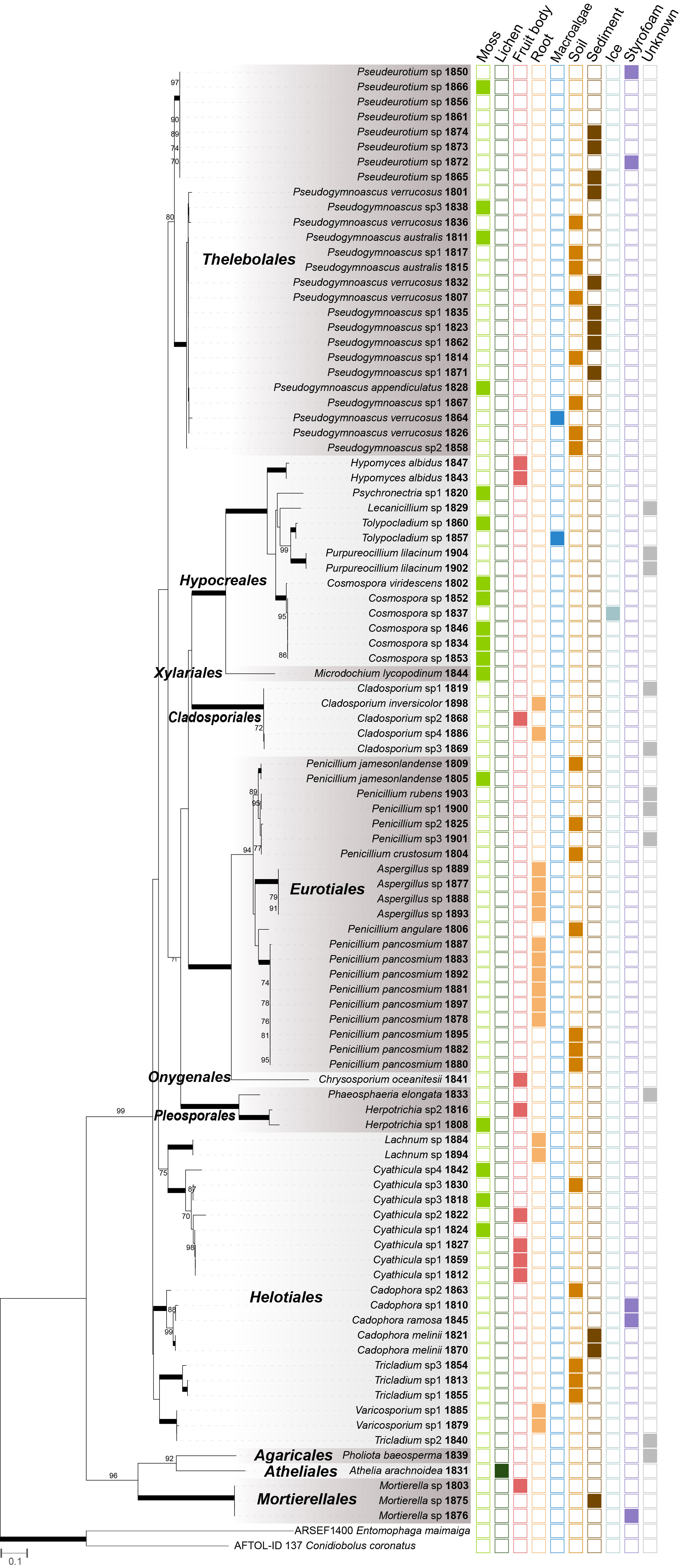 A total of 97 Antarctic fungal strains were isolated from biotic (moss, lichen, fruit body, macroalgae, and root) and abiotic substrates (soil, sediment, ice, and styrofoam) in similar proportions (Fig. 2), with 48% and 40% of each substrate type, respectively. The substrate type with the highest number of fungal strains was soil (20 strains), followed by moss (18 strains), and roots (16 strains; Table 1).