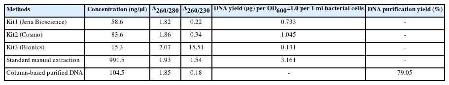 In this method, three commercial kits were used: Bacteria DNA Preparation kit for DNA isolation (Cat. # PP-2152, Jena Bioscience), LaboPass Bacteria Mini (Cat. # CMBA0112, CosmoGenetech), and Total DNA Extraction S&V Kit (Cat. # DN40200, Bionics).