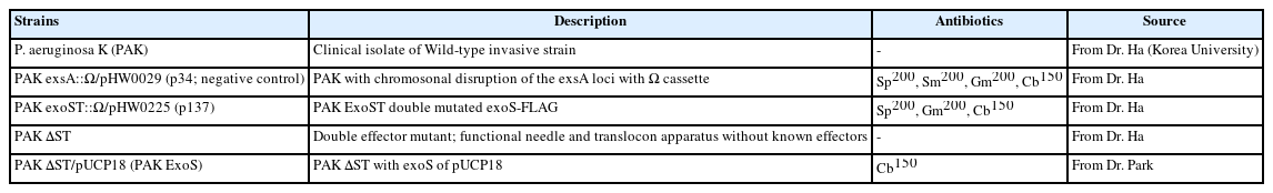 | P. aeruginosa K (PAK) | Clinical isolate of Wild-type invasive strain | - | From Dr. Ha (Korea University) |