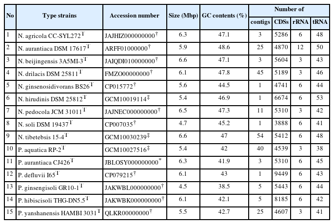 Fatty acid composition of strain CJ426T and related type strains. Strains: 1, CJ426T; 2, P. hibiscisoli THG-DN5.5T; 3, P. yanshanensis HAMBI 3031T; 4, P. defluvii I65T; 5, P. ginsengisoli GR10-1T; 6, P. aquatica RP-2T; 7, N. beijingensis 3A5MI-3T; 8, N. soli DSM 19437T; 9, N. tibetensis 15-4T; 10, N. agricola CC-SYL272T; 11, N. pedocola JCM 31011T; 12, N. aurantiaca DSM 17617T; 13, N. drilacis DSM 25811T; 14, N. hirudinis DSM 25812T; 15, N. ginsenosidivorans BS26T. -, Fatty acid amounts < 1.0% or not detected. The data for strain CJ426 was obtained from this study, while the data for other strains were taken from published literature.