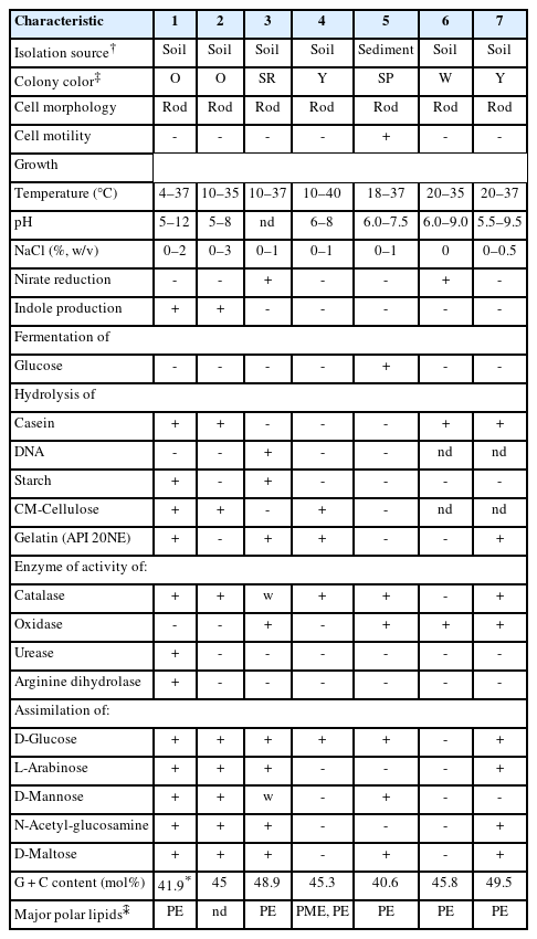 The cellular morphology of strain CJ426T was observed using transmission electron microscopy. Cells were grown for two days at 30℃ on R2A agar. Growth was assessed on various agar media, including R2A agar, tryptic soy agar (TSA), Luria-Bertani (LB) agar, nutrient agar (NA), and marine agar (MA). To evaluate growth temperatures, cells were cultured on R2A agar at 4, 10, 15, 20, 25, 30, and 37℃. The pH growth range was determined using 0.1 M citrate buffer (pH 4.0–5.0), 0.1 M phosphate buffer (pH 6.0–8.0), and 0.1 M bicarbonate–carbonate buffer (pH 9.0–10.0), 0.05 M disodium hydrogen phosphate-sodium hydroxide buffer (pH 11.0–12.0), and 0.2 M potassium phosphate-sodium hydroxide buffer (pH 13.0) in R2A broth (Bates and Bower, 1956). Salt tolerance was tested by supplementing R2A broth with 0–3% (w/v) NaCl (at 1% intervals). Both the NaCl tolerance and pH range experiments were conducted at 30℃ for up to 3 days. Gram-staining was performed using a Gram-staining kit according to the manufacturer’s protocols (Sigma-Aldrich). Gliding motility was examined on semisolid R2A media containing 0.4% agar. Anaerobic growth was determined after two weeks of incubation at 30℃ on R2A agar using the GasPak Anaerobe Pouch System (BD). The production of flexirubin-type pigments was tested using a 20% KOH test and interpreted by changes in colony color. Oxidase and catalase activities were determined using oxidase reagent (bioMerieux) and a 3% (v/v) aqueous H2O2 solution, respectively. Hydrolysis of starch, cellulose, casein, and DNA was tested using media containing 1.0% (w/v) soluble starch, 0.2% (w/v) carboxymethyl (CM) cellulose, 3% (w/v) skimmed milk, and DNase test agar (BD), respectively. Results of the hydrolysis tests were evaluated after 2 days of incubation. Carbon source utilization and enzymatic activities of strain CJ426T were determined using the API 20NE according to the manufacturer’s instructions.