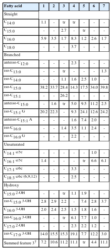 The polar lipids of strain CJ426T were extracted from 100 mg of freeze-dried cells cultured in R2A agar for two days at 30℃ and analyzed by two-dimensional silica gel thin-layer chromatography (TLC) (Tindall, 1990a, 1990b). Total lipids and specific functional group lipids were detected using molybdophosphoric acid, molybdenum blue spray, ninhydrin reagent and α-naphthol. The respiratory quinone was extracted as described by Minnikin et al. (1984) and determined by high performance liquid chromatography (HPLC) analysis using a reverse phase column (Apollo C18, 250 × 4.6 mm, 5 μm) (Collins, 1985). The quinones were eluted by a mixture of methanol and 2-propanol (4:1, v/v) with a flow rate of 1 ml/min and detected by UV absorbance at 270 nm. For fatty acid analysis, strain CJ426T and related type strains were cultivated in R2A broth at 30℃ and harvested at the exponential growth phase. Fatty acids were saponified, methylated, and extracted following the standard protocol of the Sherlock Microbial Identification System (MIDI) version 6.2 and analyzed by the standard protocol of gas chromatography (Agilent Technologies). The cellular fatty acids were identified using the RTSBA6 database of the Microbial Identification System (Sasser, 1990).