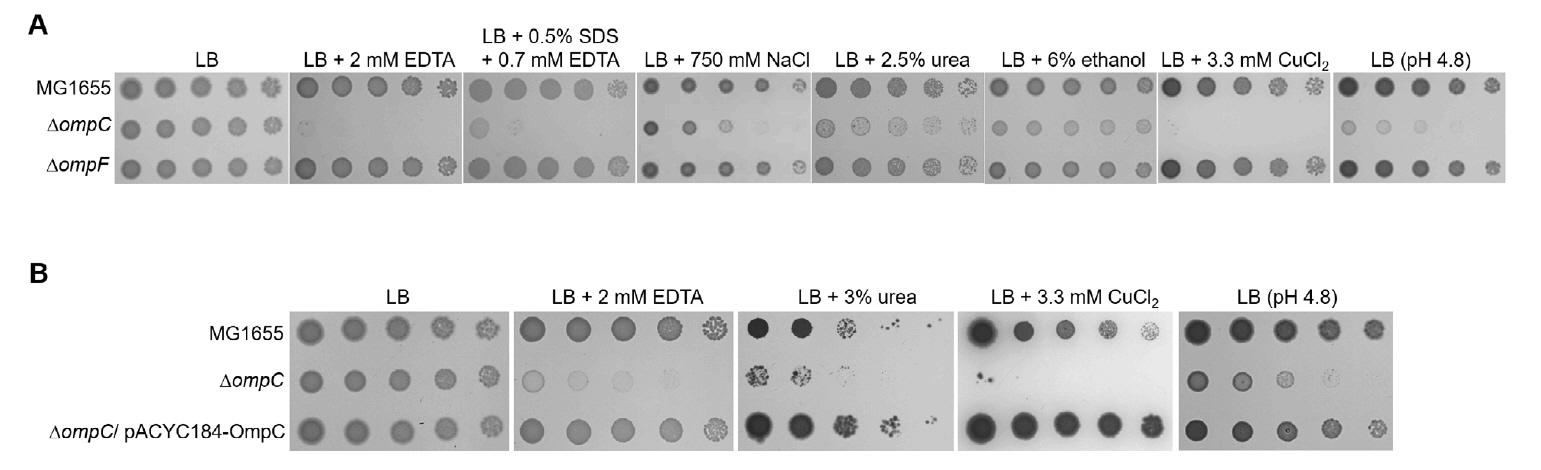 Fig. 1.The sensitivity of the ompC mutant to various envelope stresses. (A) The effect of depletion of OmpC on overcoming envelope stresses. (B) Complementation of the sensitivity of the ompC mutant to envelope stresses. (A and B) The cells of the indicated strains were serially diluted from 108 to 104 cells/ml in 10-fold steps and spotted onto an LB plate, LB plates containing indicated materials, or an LB plate adjusted to pH 4.8. All experiments were performed in triplicate, and a representative image is presented.