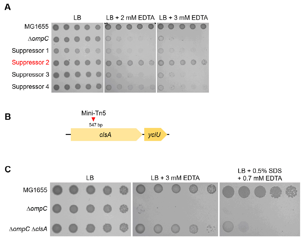 Fig. 2.The effect of the cardiolipin synthase ClsA on the sensitivity of the ompC mutant to envelope stresses. (A) Isolation of the suppressor mutant of the ompC mutant. The cells of the indicated strains were serially diluted from 108 to 104 cells/ml in 10-fold steps and spotted onto LB plates with or without the indicated concentrations of EDTA. (B) Schematic representation of a mini-Tn5 insertion site. The mini-Tn5 insertion site of a suppressor mutant (suppressor 2) has been indicated using a red arrow. (C) The depletion of ClsA partially suppresses the sensitivity of the ompC mutant to envelope stresses. The cells of the indicated strains were serially diluted from 108 to 104 cells/ml in 10-fold steps and spotted onto LB plates with or without the indicated materials. The experiments were performed in triplicate, and a representative image is presented.