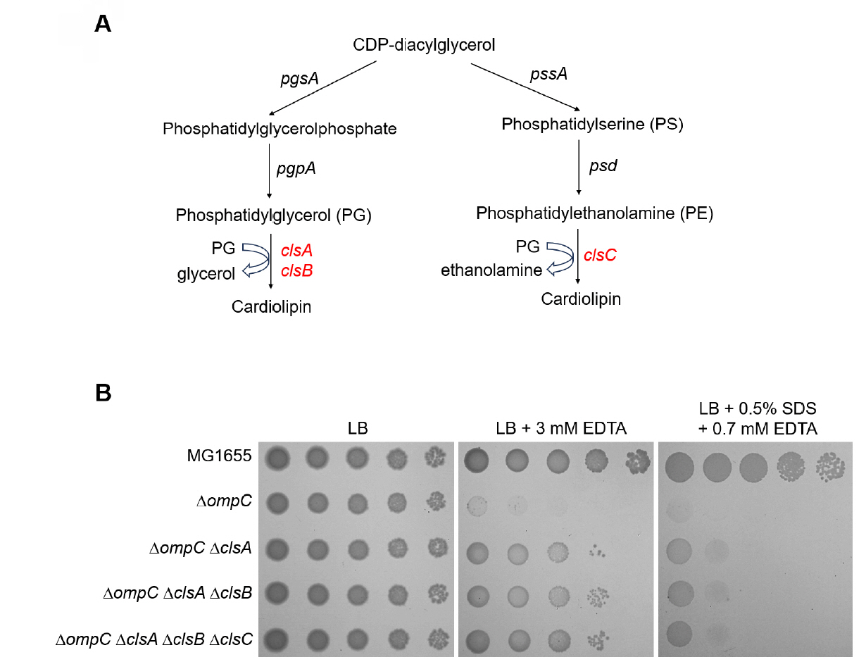 Fig. 3.The effect of other cardiolipin synthases, ClsB and ClsC, on the sensitivity of the ompC mutant to envelope stresses. (A) Schematic representation depicting two distinct pathways of cardiolipin biosynthesis. ClsA and its isozyme ClsB synthesize cardiolipin through catalyzing the condensation of two PGs with a concomitant release of glycerol. ClsC synthesizes cardiolipin through catalyzing the condensation of PG and PE with a concomitant release of ethanolamine. (B) Additional depletions of ClsB and ClsC hardly affect suppression of the sensitivity of the ompC mutant to envelope stresses. The cells of the indicated strains were serially diluted from 108 to 104 cells/ml in 10-fold steps and spotted onto LB plates with or without the indicated materials. The experiments were performed in triplicate, and a representative image is presented.
