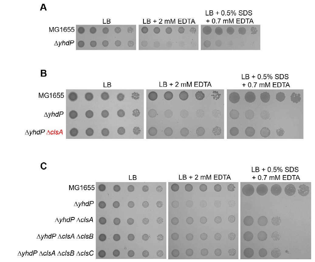 Fig. 4.The effect of the cardiolipin synthase ClsA on the sensitivity of the yhdP mutant to envelope stresses. (A) The effect of depletion of YhdP on overcoming envelope stresses. (B) The depletion of ClsA partially suppresses the sensitivity of the yhdP mutant to envelope stresses. (C) Additional depletions of ClsB and ClsC hardly affect suppression of the sensitivity of the yhdP mutant to envelope stresses. (A–C) The cells of the indicated strains were serially diluted from 108 to 104 cells/ml in 10-fold steps and spotted onto LB plates with or without the indicated materials. The experiments were performed in triplicate, and a representative image is presented.