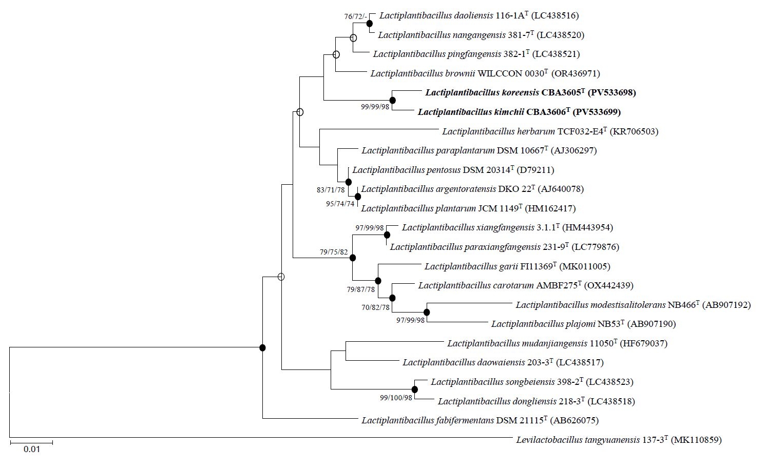 Fig. 1.Phylogenetic tree constructed based on 16S rRNA gene sequences of strains CBA3605T, CBA3606T, and other type strains of the genus Lactiplantibacillus using the neighbor-joining method. Bootstrap values based on 1,000 replicates are shown at the nodes, but only those exceeding 70.0% are displayed for the neighbor-joining, maximum-parsimony, and maximum-likelihood methods. Filled circles indicate nodes supported by all three treeing methods. Levilactobacillus tangyuanensis 137-3T (MK110859) was used as the outgroup. Scale bar represents 0.01 substitutions per nucleotide position.